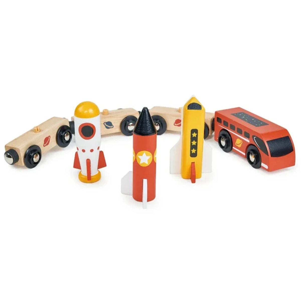 Skip to contentDecorated in bright oranges and yellows, the 3 rocket carriages are magnetically attached to one another and the engine. Compatible with other major wooden train tracks, a wooden train engine and three carriages, with removable rockets.