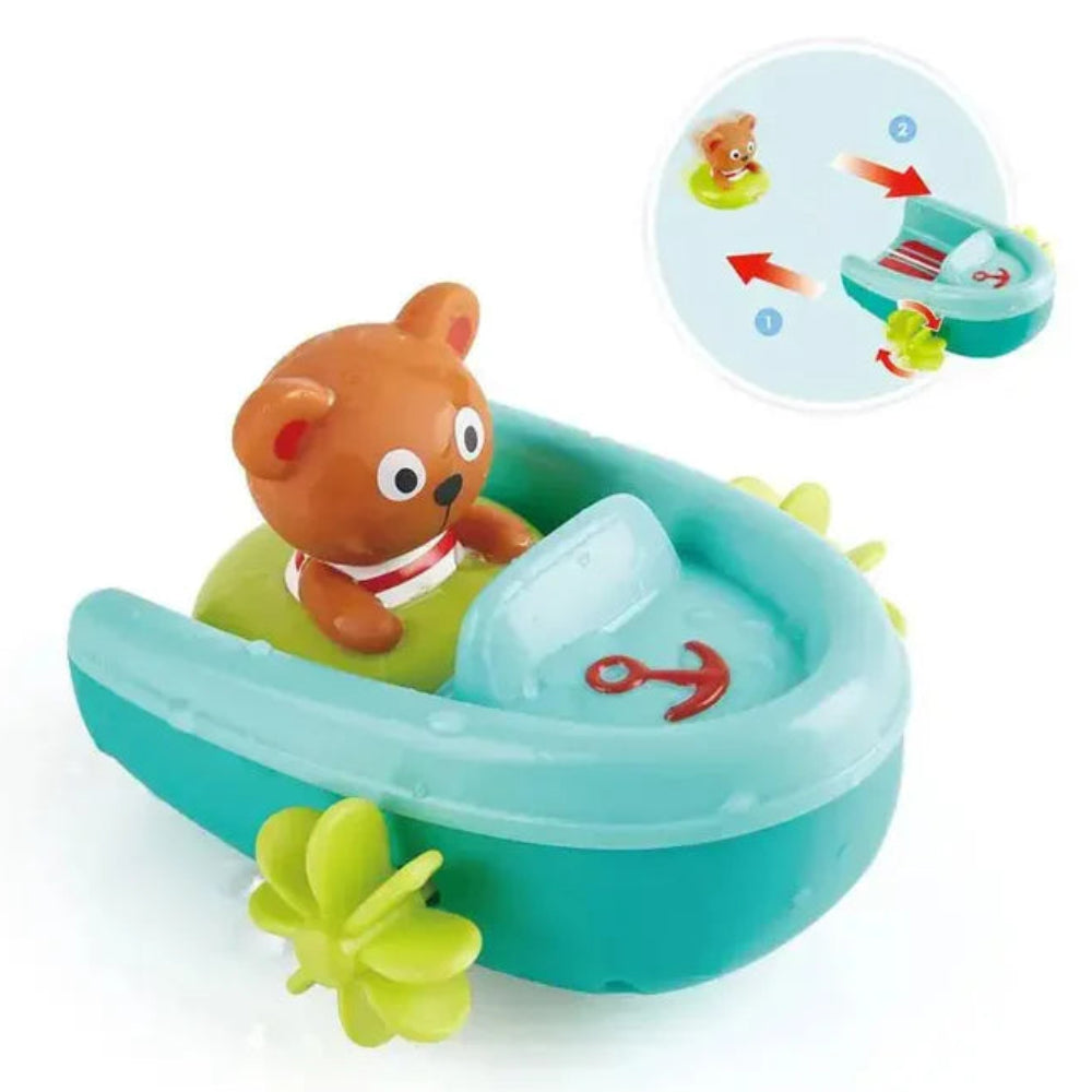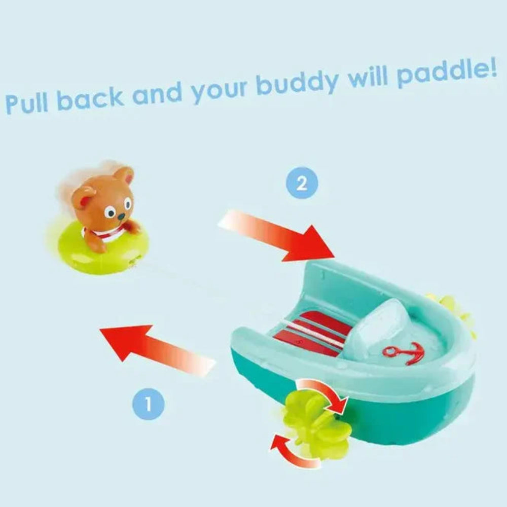 Skip to contentWind up this adorable bear and let the aquatic adventure begin! As he zooms back on his string, he'll glide across the water in his tube while the boat paddles away, creating delightful splashes and a charming wake.