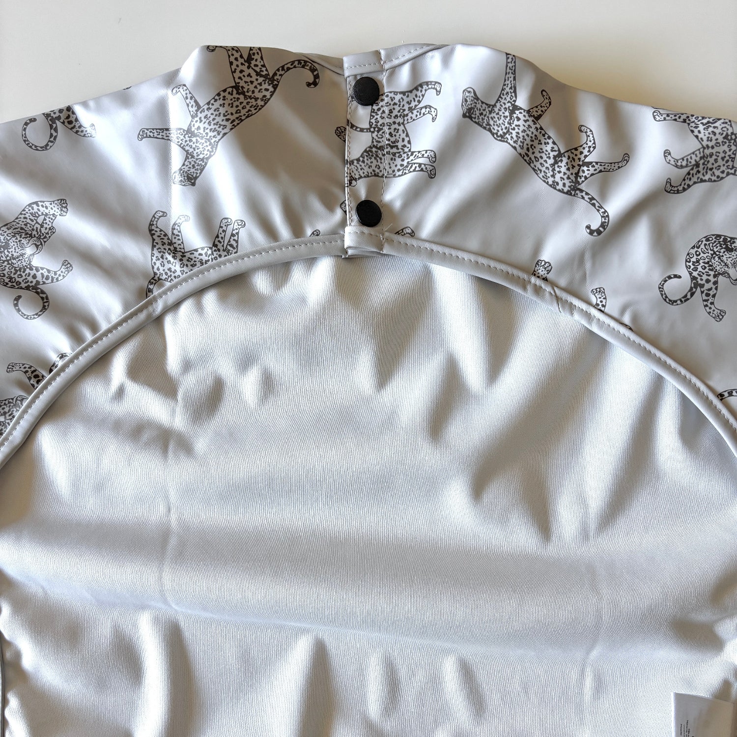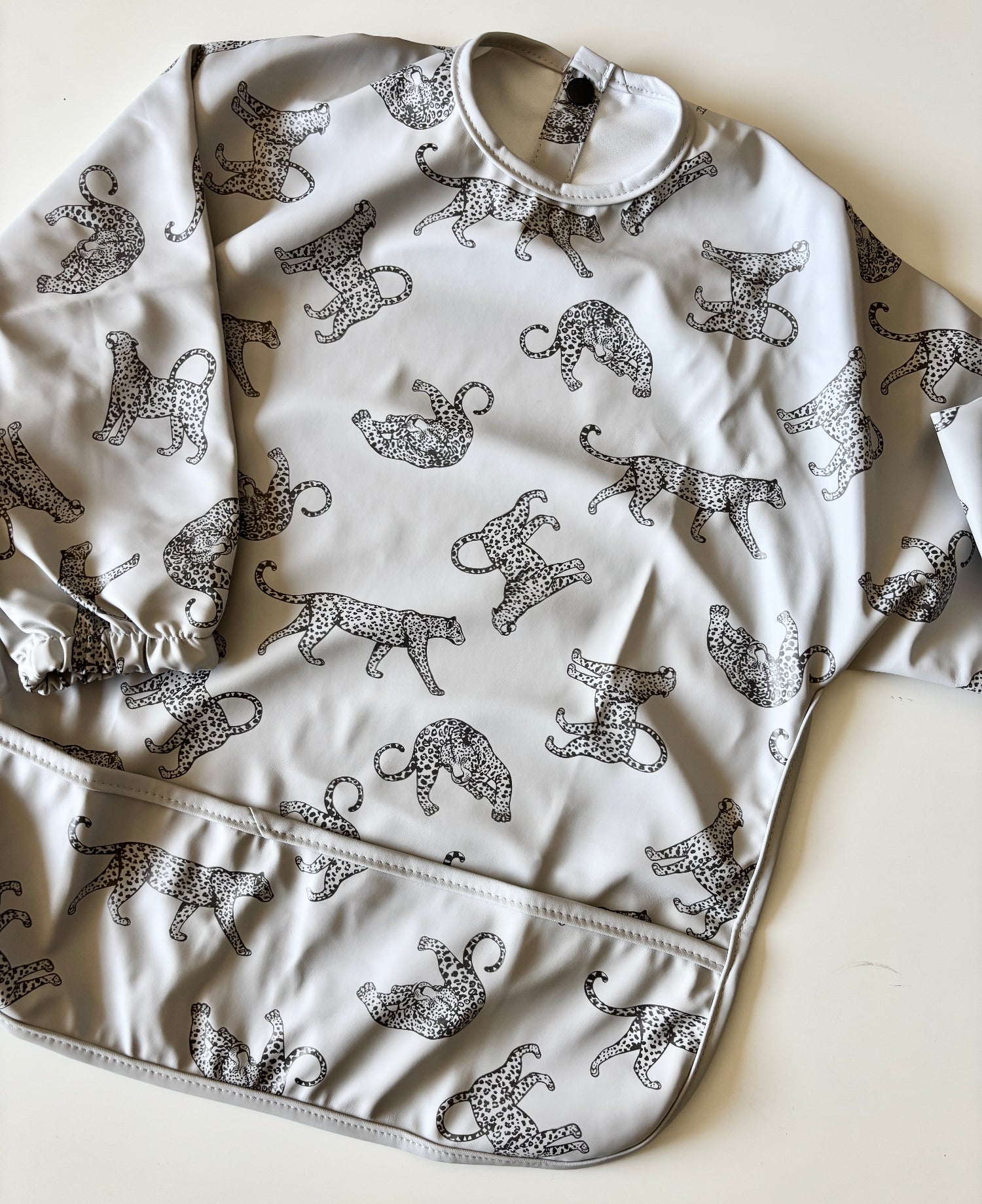 Skip to contentA waterproof and protective smock for meal time, arts and crafts or what ever your full coverage needs are. In a wild cat theme, it is designed with an adjustable neckline with snaps and elasticized cuffs, and comes in 3 sizes. The practical pocket is perfect for catching crumbs, making clean-up easy!