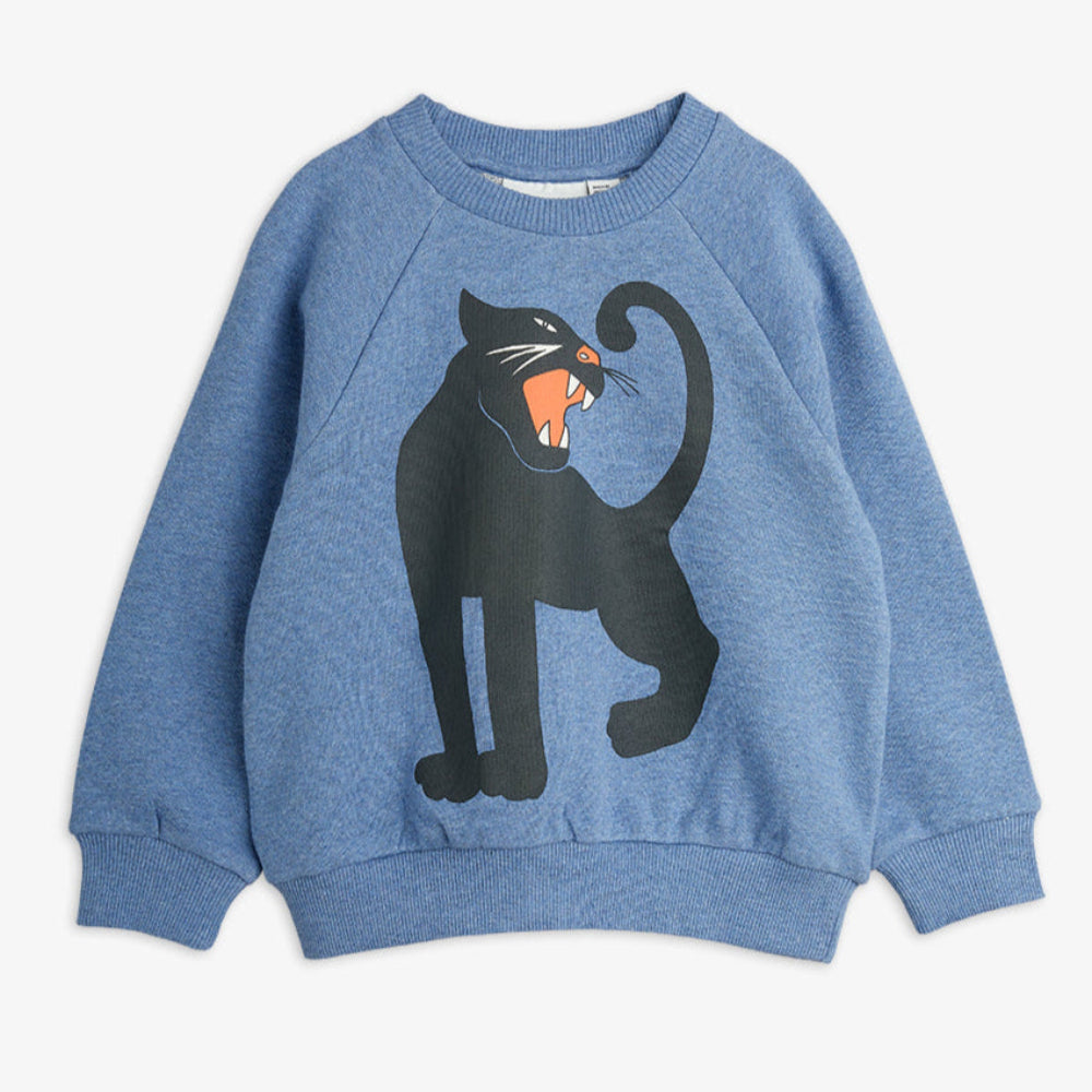 Skip to contentThis blue melange sweatshirt showcases a big Panther print on the front and is crafted from 100% GOTS certified organic cotton. It has comfy raglan sleeves and ribbing at the neckline, cuffs, and hem. With its relaxed cut and ribbed details, it offers a cozy and fun look perfect for playful days.