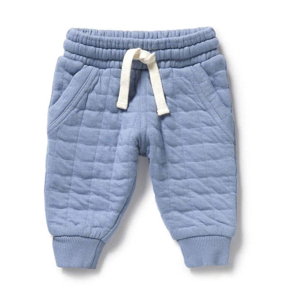 Skip to contentWrap your little bundle of joy in comfort with this sky blue organic cotton quilted pant. With soft rib cuffs and a roomy fit, this pant will keep your baby warm and cozy during the winter months. The gentle elastic waistband won't irritate their tummy, making this pant a Winter must-have.