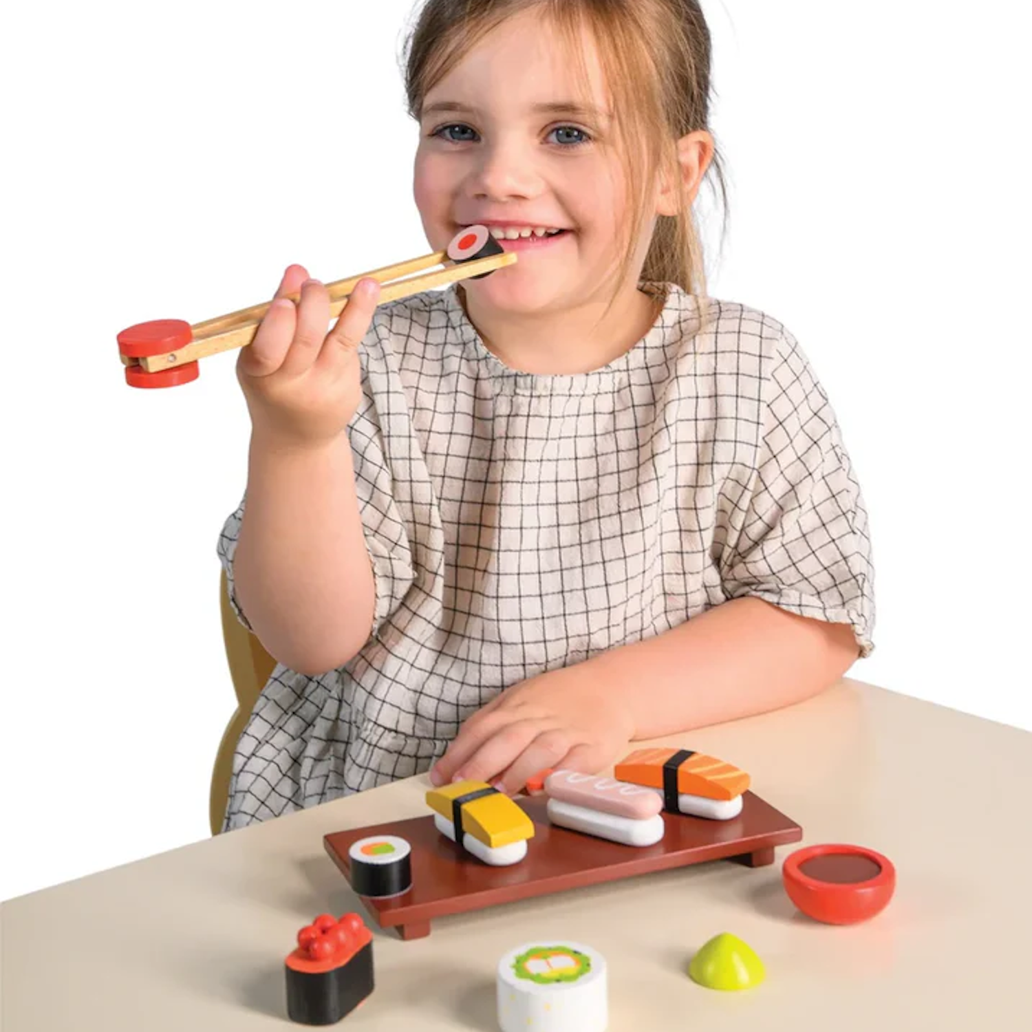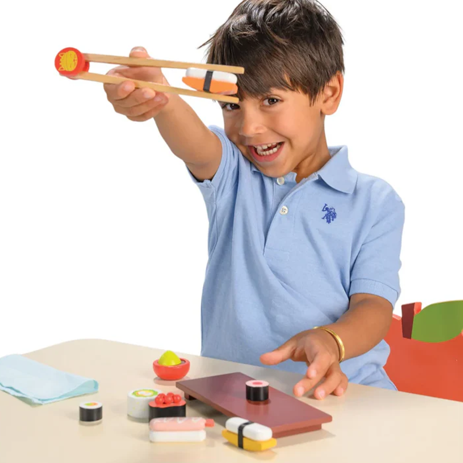 Skip to contentHone your chopstick skills with this adorable sushi set! It includes 7 sushi pieces in various shapes, ready to be picked up and dipped into soy sauce and wasabi. All served on a cute platform-style table. Perfect for boosting hand coordination while having fun with pretend play.
