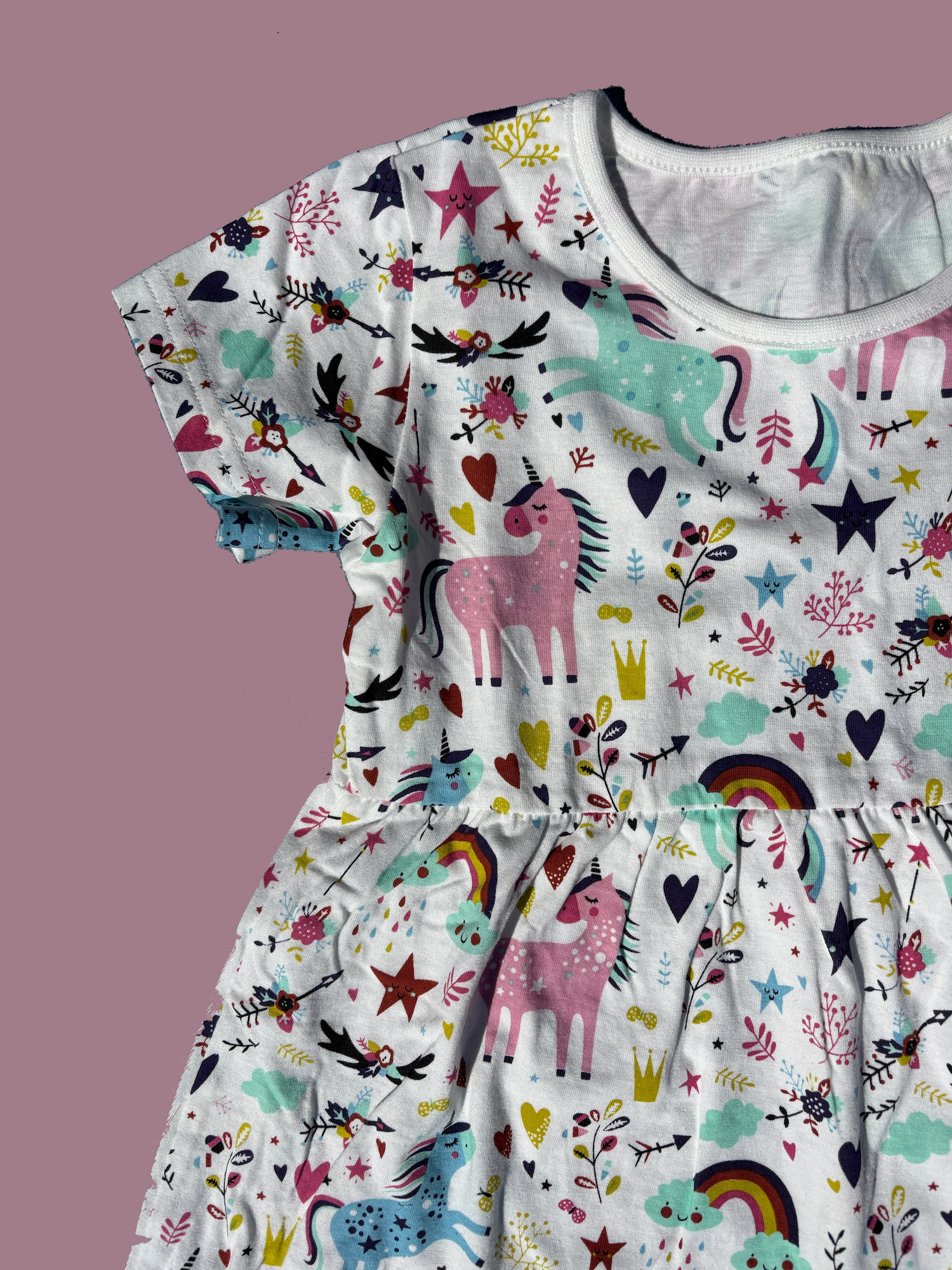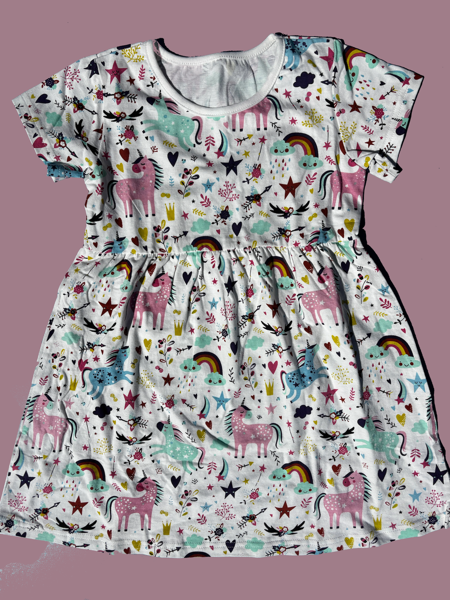 Adorable playful unicorn cotton dress for summer with unicorn, rainbow and stars all over. A skater style dress with a skirt that is twirl worthy.