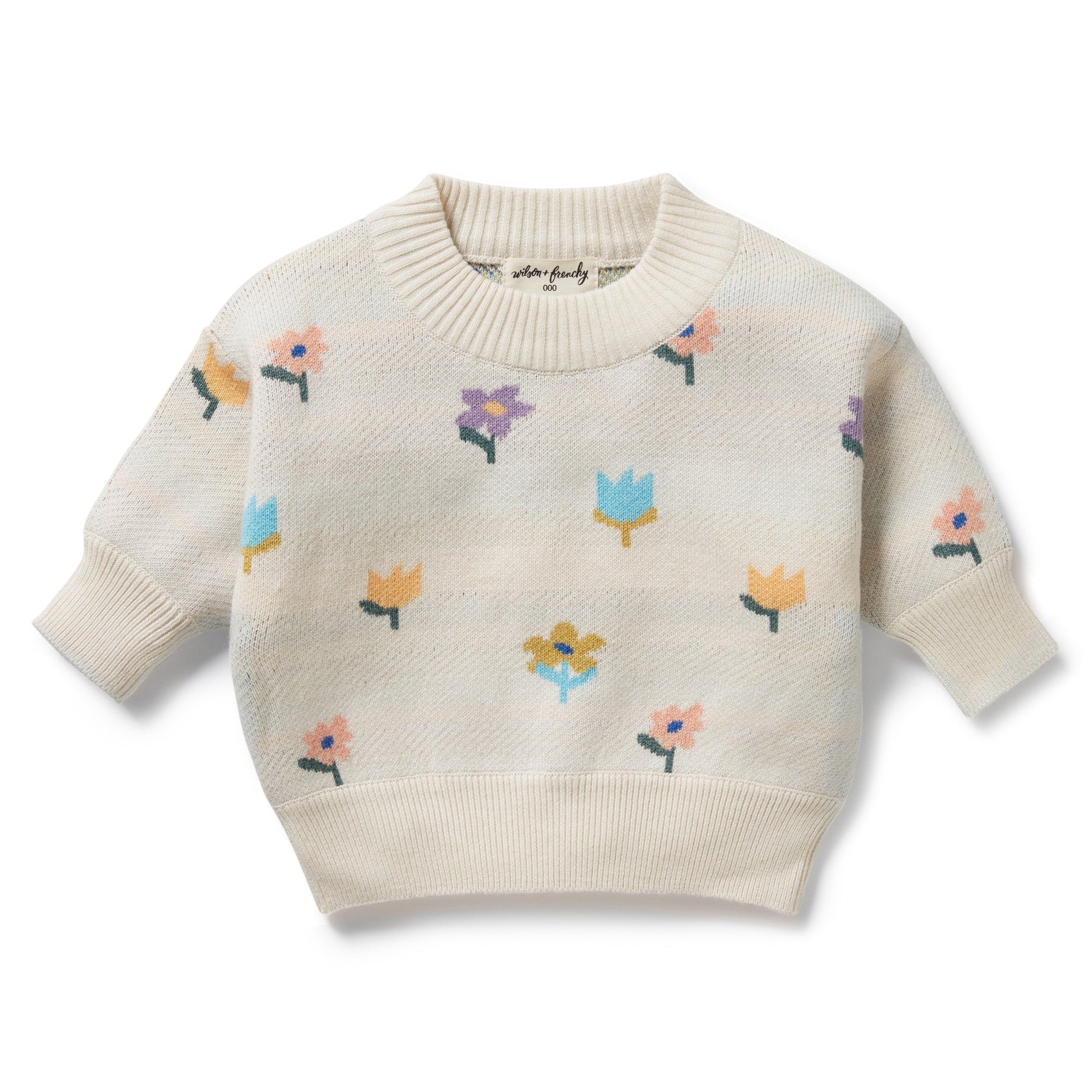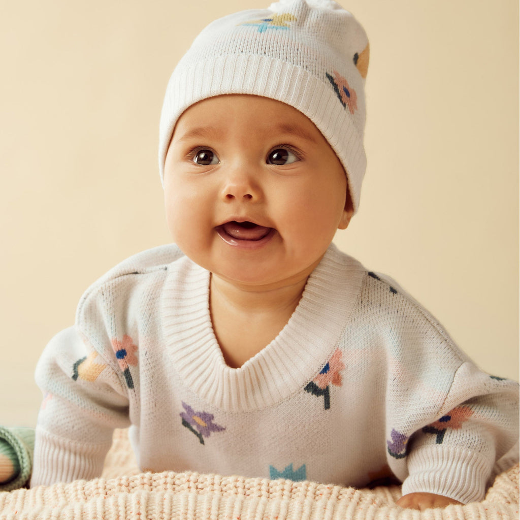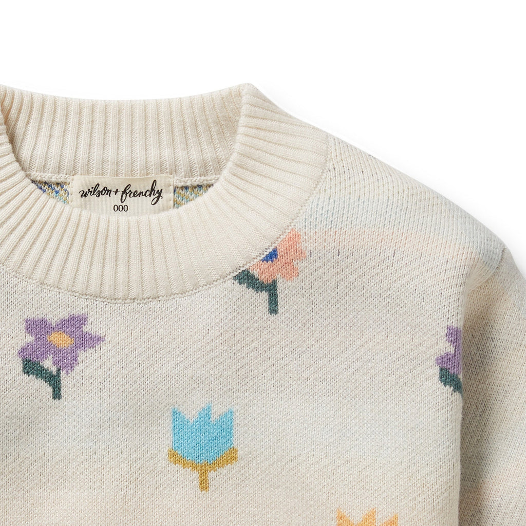 Skip to contentGet ready to cuddle them up in style in an organic cotton, wool, and bamboo jacquard knit sweater. The roomy fit and ribbed cuffs and neckline provide comfort, while the cute flower pop design adds some playful charm. Stay warm and trendy! Baby and kid approved.