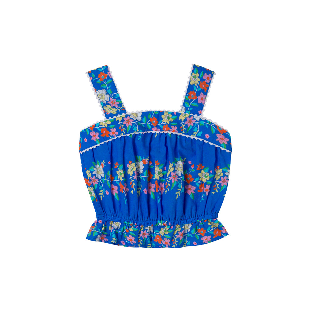 The Alba Top in a vibrant blue floral print — a perfect summer tank top for kids featuring a comfortable elasticated waist, ric-rac trimmed straps that can be worn straight or crossed, and covered buttons for a classic touch. This girls' floral tank top combines style with comfort, ideal for warm weather play and everyday wear. Made from 100% soft cotton, this children's summer top offers breathable fabric perfect for active kids. The wide strap design and adjustable styling make it versatile for any occasion. A timeless piece from Kidsagogo's collection of quality children's clothing.