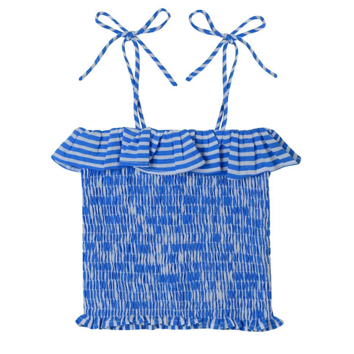 Blue and white striped summer tank top for kids featuring adjustable shoulder ties, soft elastic gathered neckline, and charming ruffle detail.