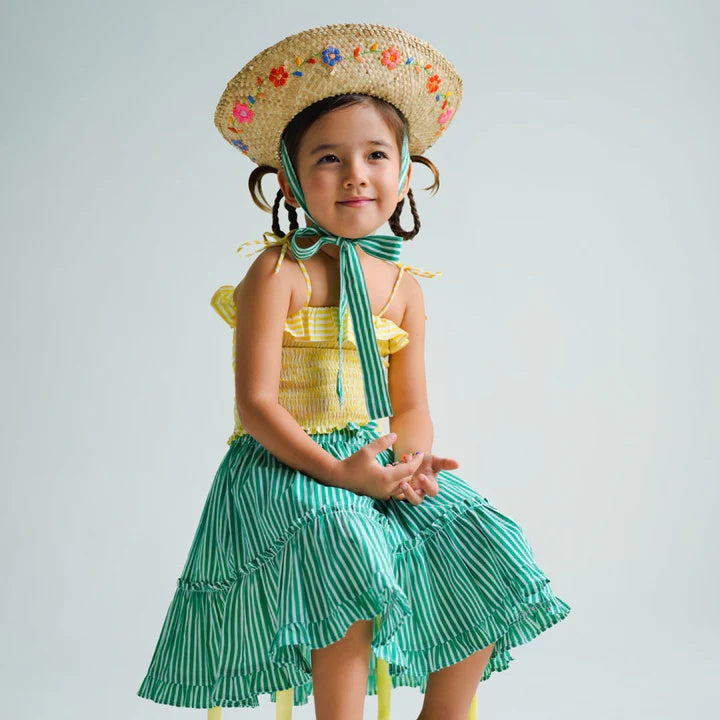 Green striped tiered girls midi skirt features a soft, adjustable elasticated waistband with a simple bow at the front. Light and flowy, perfect for sunny days and everyday play. This comfortable cotton girls skirt is ideal for active kids who love breathable, durable clothing. Great for school, playdates, and casual wear.