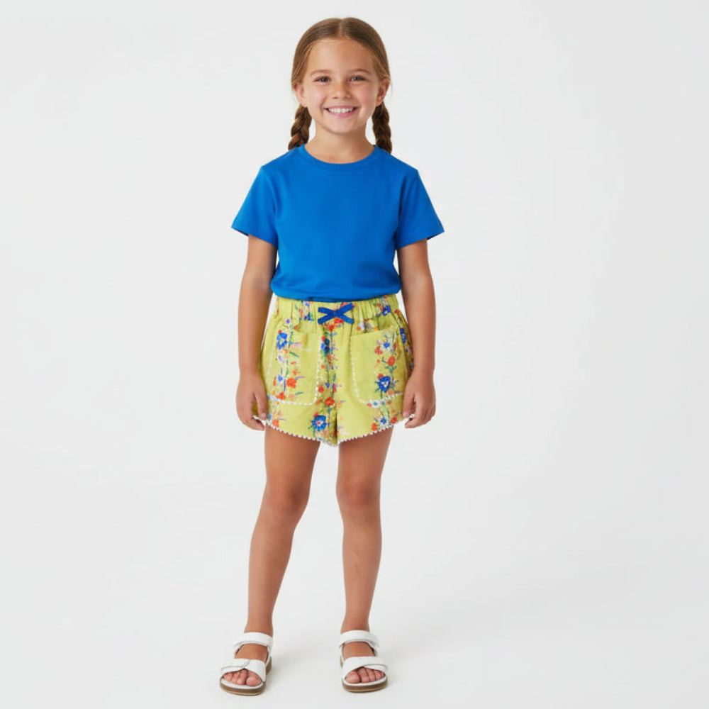 Lime green floral girls shorts with elastic waistband, front bow detail, and decorative pockets. Perfect for toddlers and kids, these cute cotton shorts feature playful scalloped ric-rac trim.