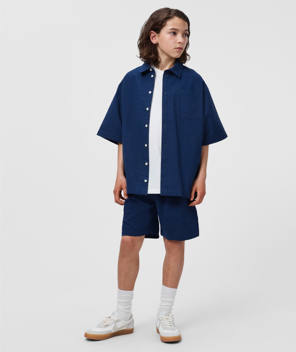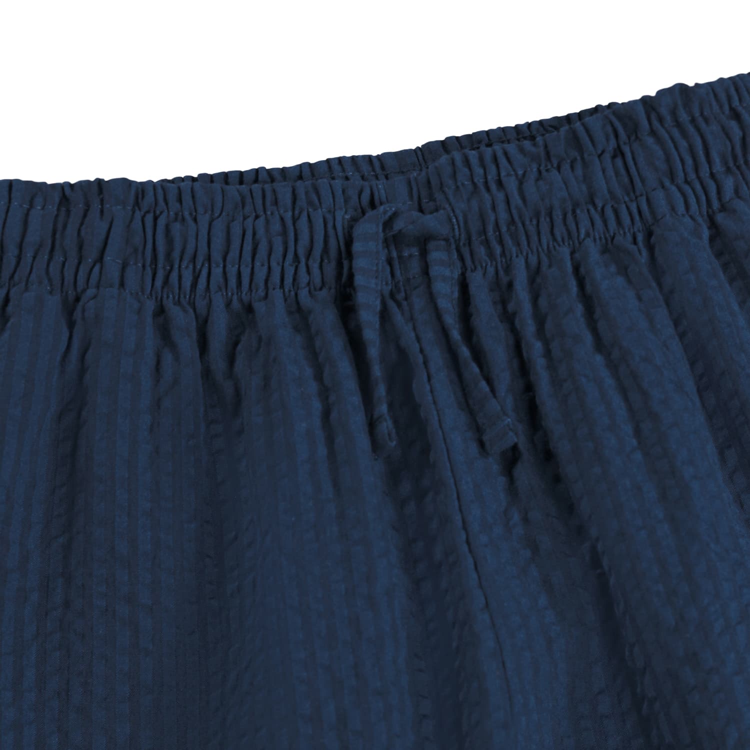 Blue-striped shorts made of soft, waffle-woven organic cotton with a relaxed and comfortable fit. They have practical side pockets and an elastic waist with drawstrings at the front for optimal fit and comfort.