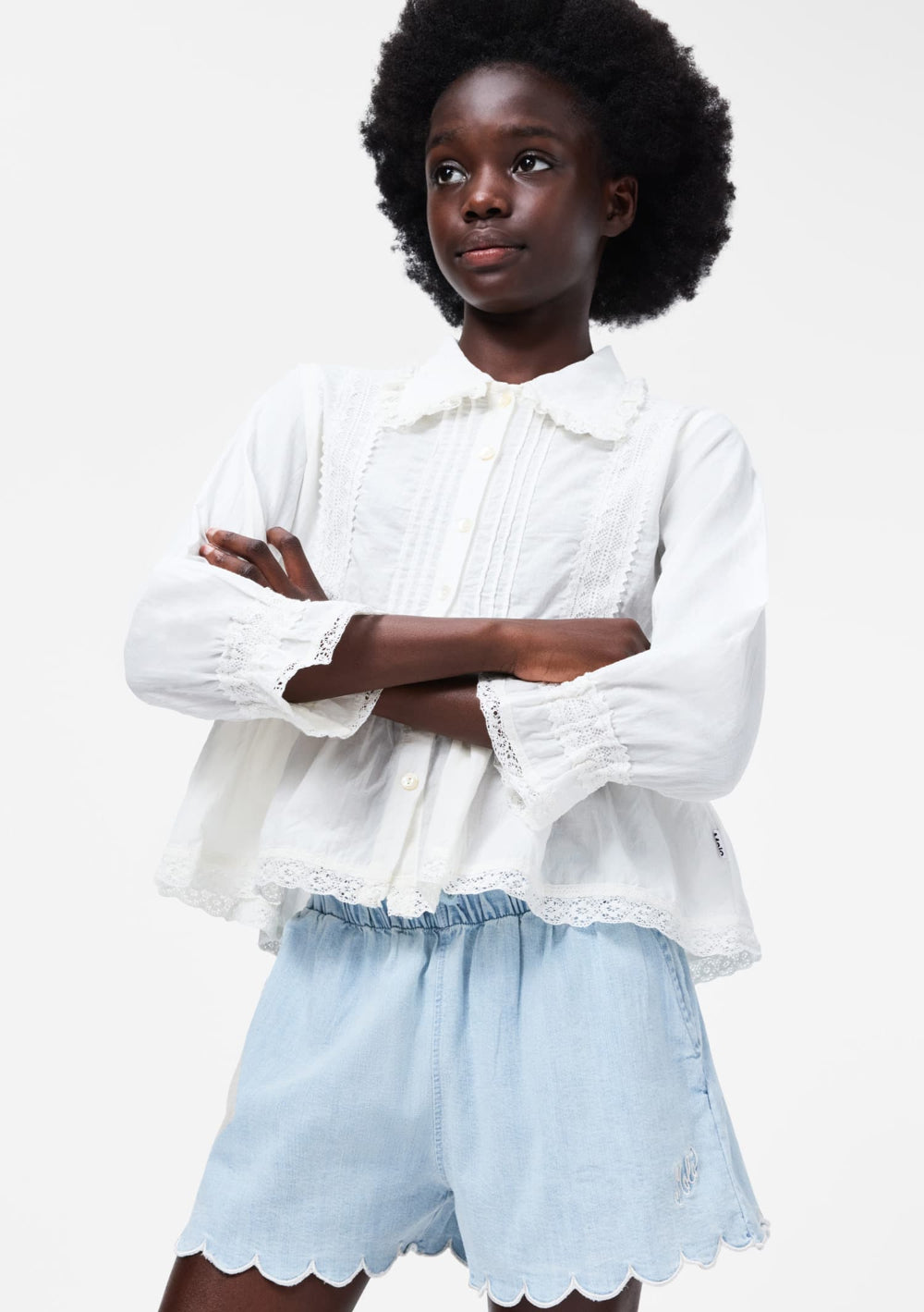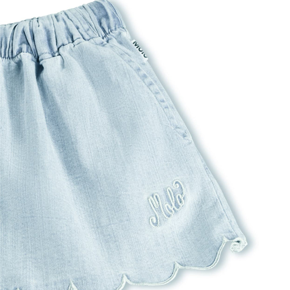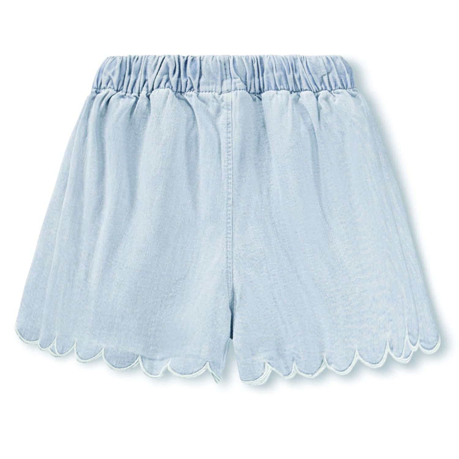 Light blue, loose shorts made of organic cotton chambray. The shorts have decorative scalloped edges, fine embroidery details, side pockets, an elastic waist with a drawstring, and a loose fit.