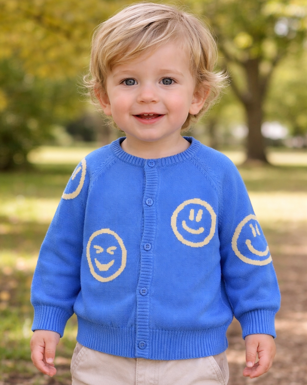 Wrap your little one in cozy comfort with this cheerful blue knitted cardigan crafted from organic cotton. Featuring playful smiley face designs, raglan sleeves, and a soft round neckline trimmed with ribbed edges, it's the perfect piece for adding personality to any outfit. Gentle on delicate skin and fun to wear..
