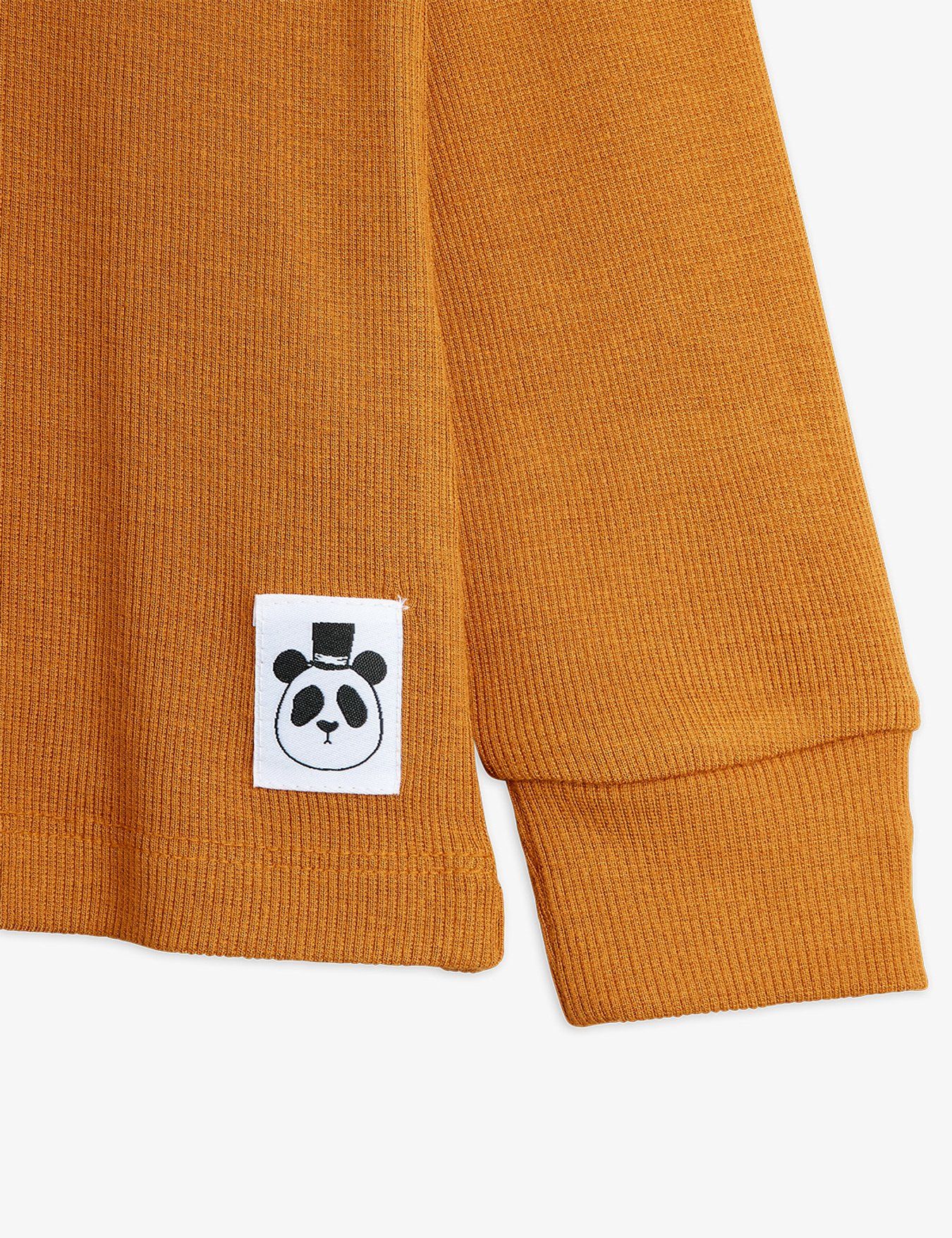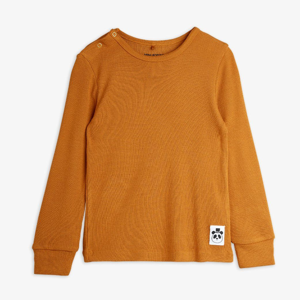 Experience ultimate comfort with this long-sleeve tee made from soft, stretchy micromodal ribbing. The convenient snap buttons on the shoulder make dressing easy, while the charming panda label adds a delightful touch. Perfect staple piece for style and comfort.
