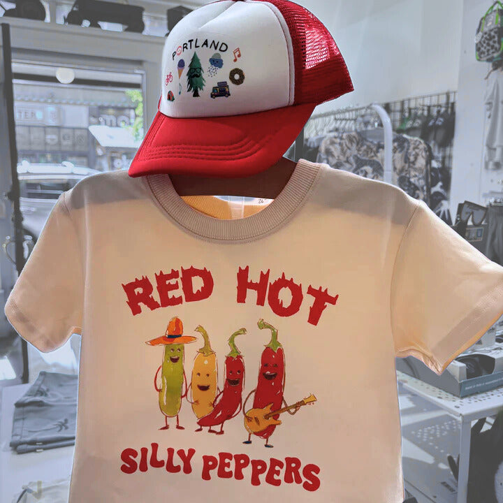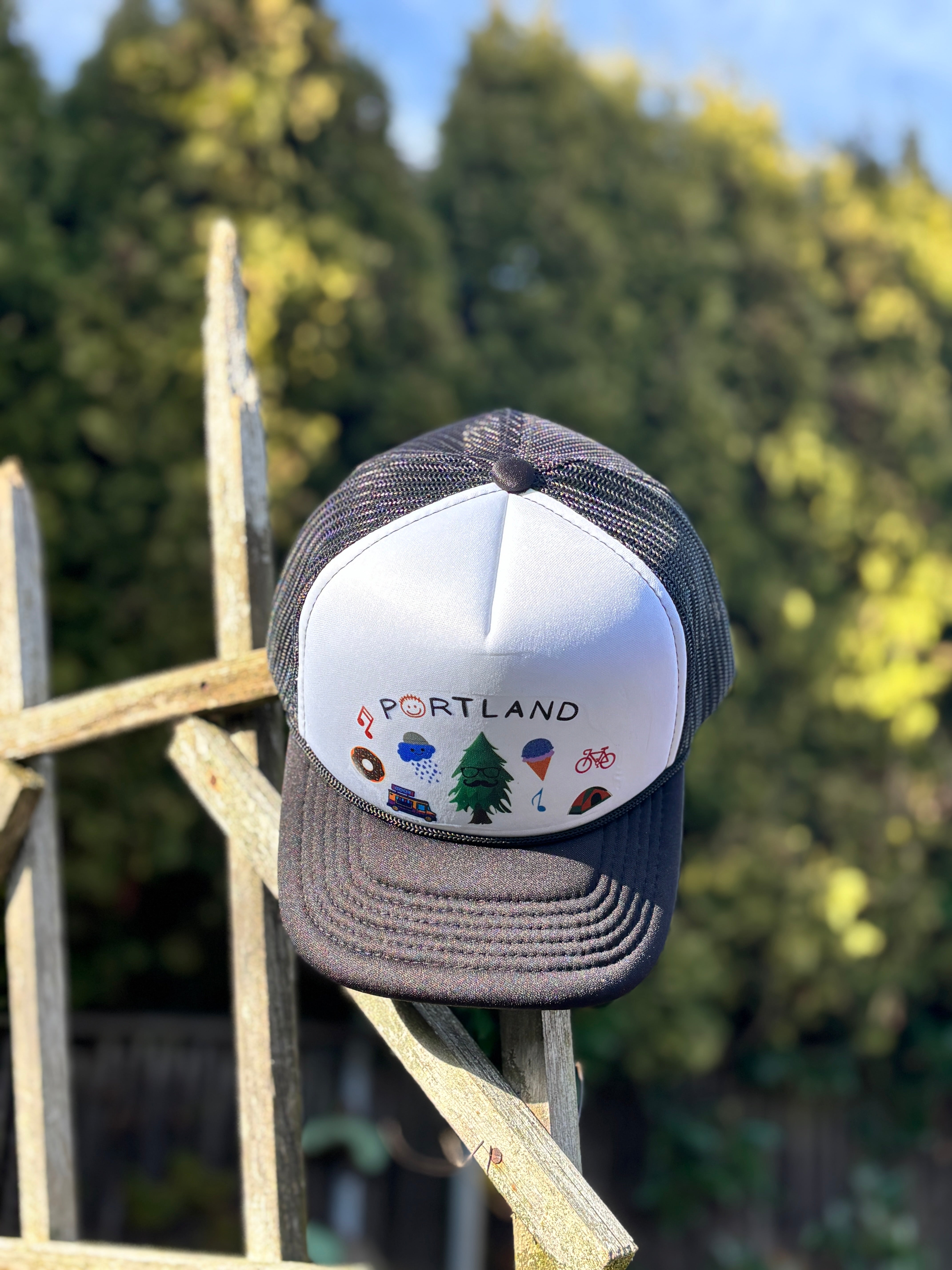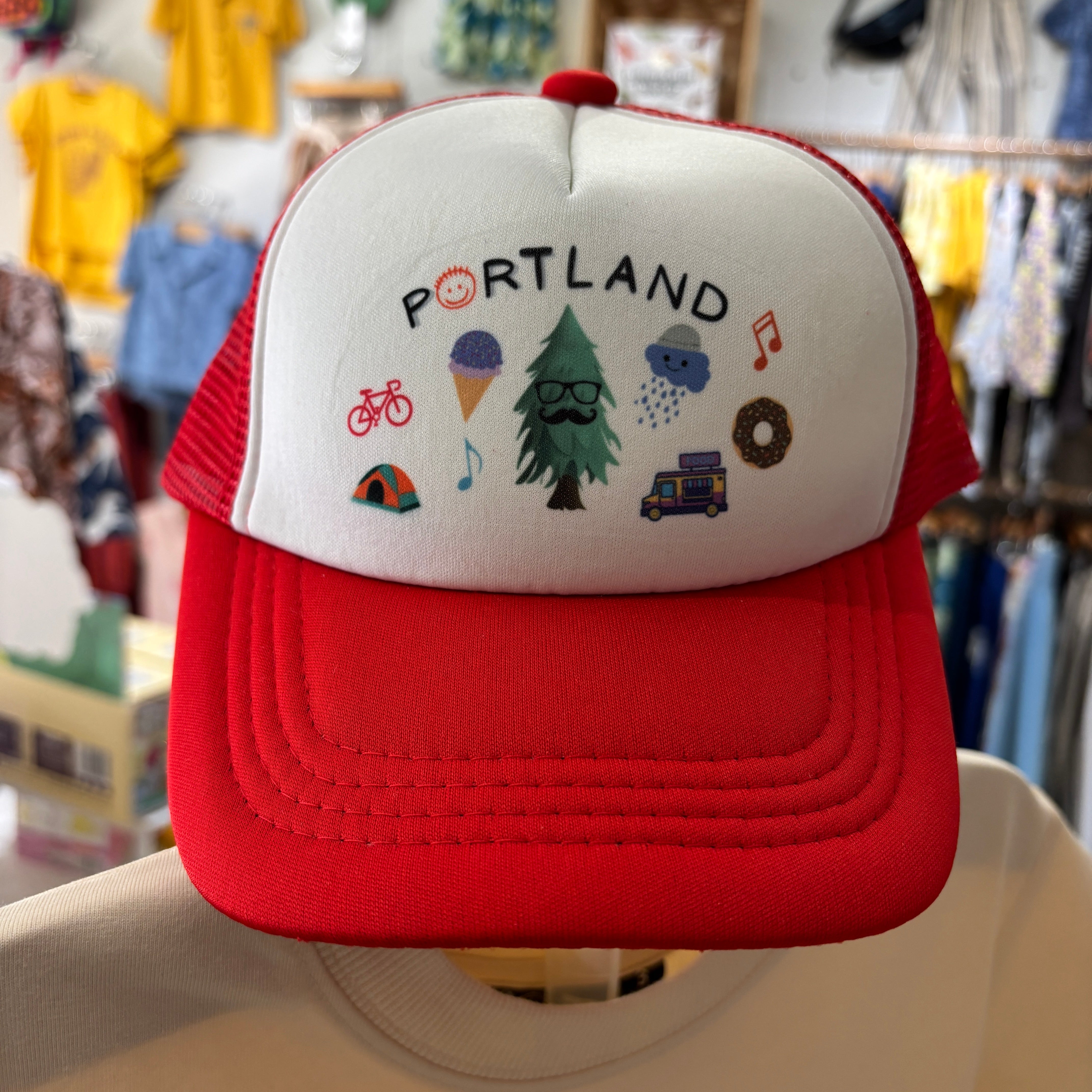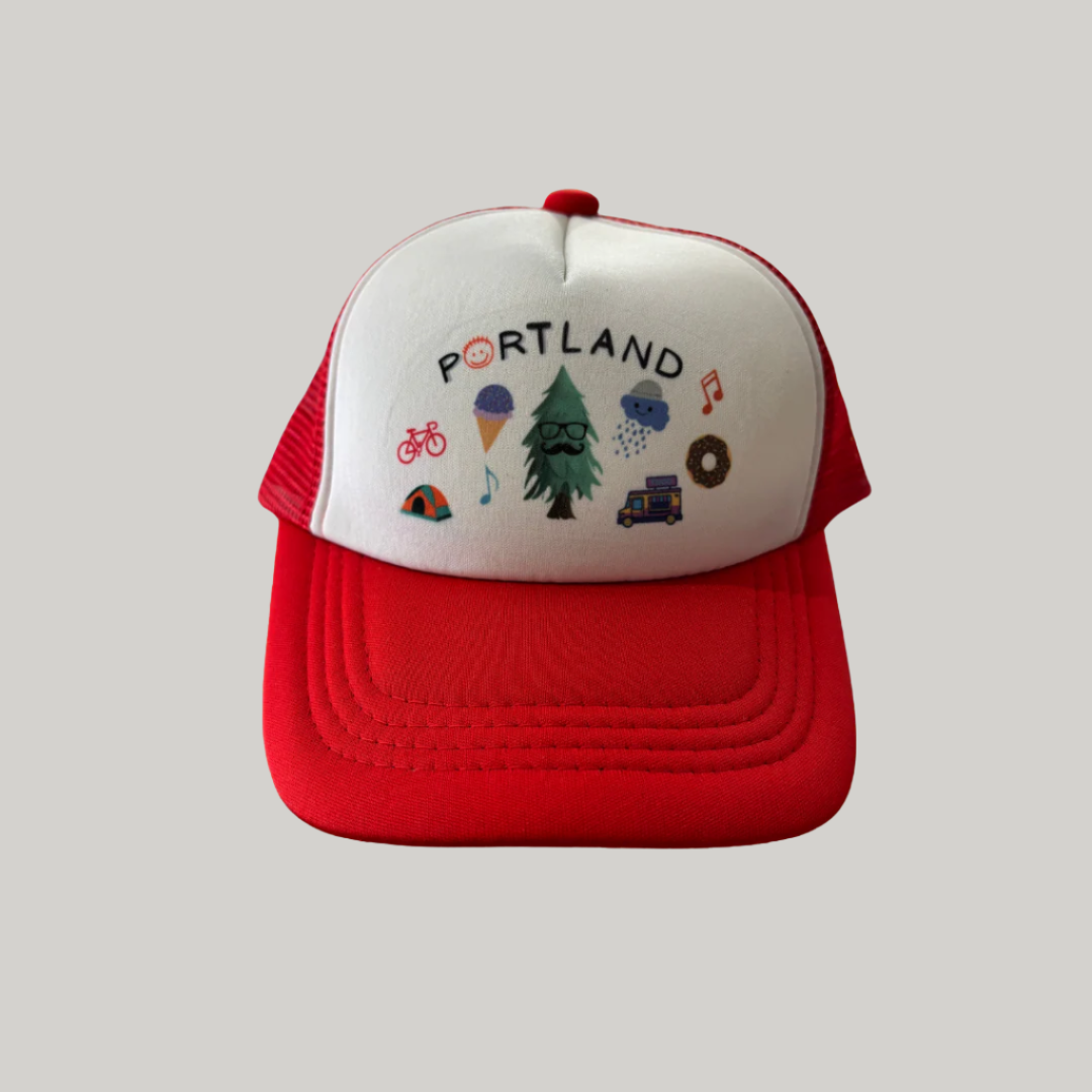 In house made and designed 'Portlands favorite things' red or gray w/white foam mesh trucker style hat for kids. Popular icons of Portland on the front of the hat: Pine tree, hipster mustache, ice cream, bicycle, food truck, rain, music and of course, life outdoors!