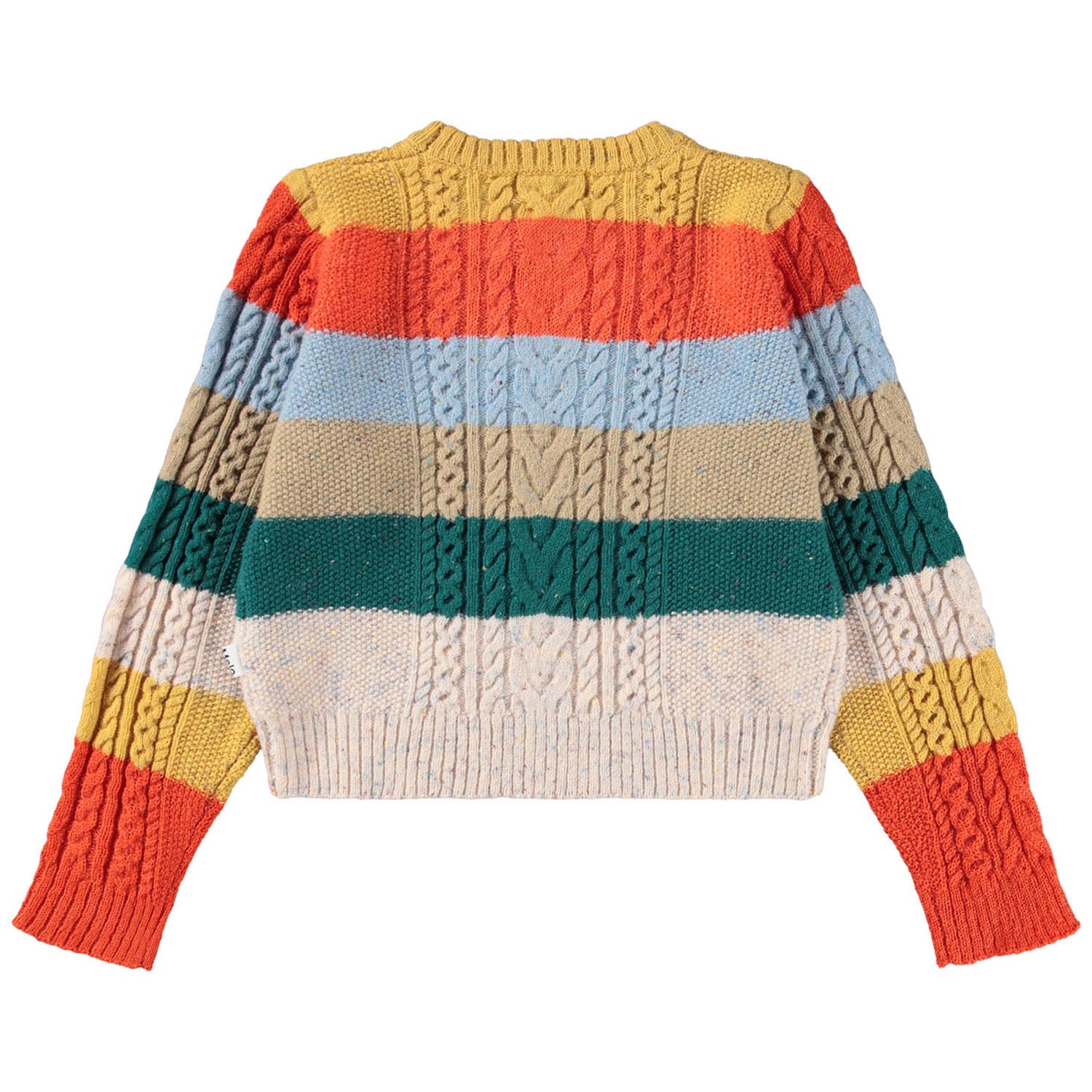 Skip to contentThis Molo wool ski sweater showcases vibrant multicolored stripes and an elegant cable knit design. With a flattering slightly cropped silhouette and ribbed details on the round neckline, sleeves, and hem, it offers both cozy warmth and standout style.