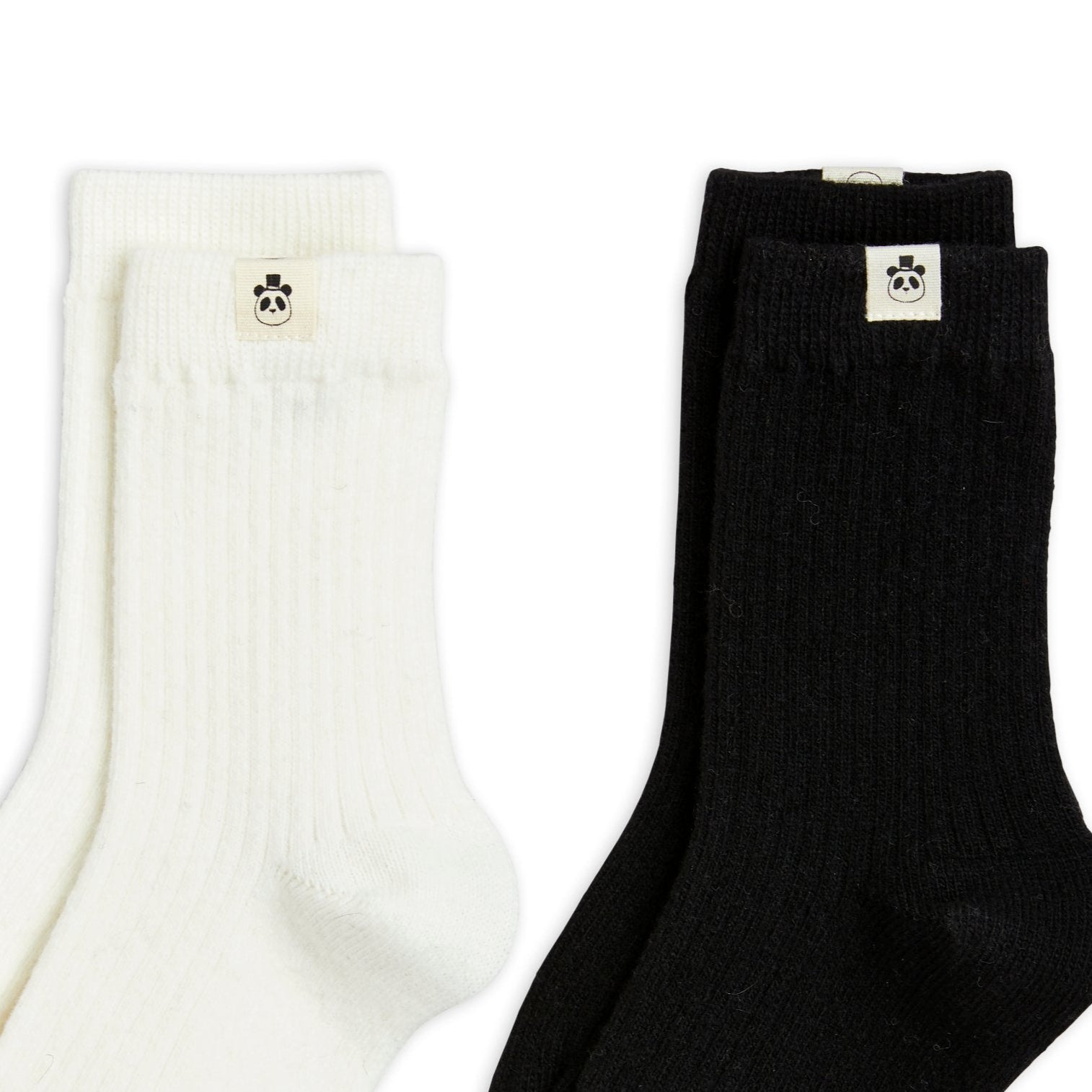 Skip to contentWhite and black 2-pack basic cotton/wool blend socks featuring a Mini Rodini Panda label on the shafts, made from a soft GOTS-certified organic wool blend with stretch. The socks are soft to the touch, comfortably stretchy, and have reinforced toe caps and heels.