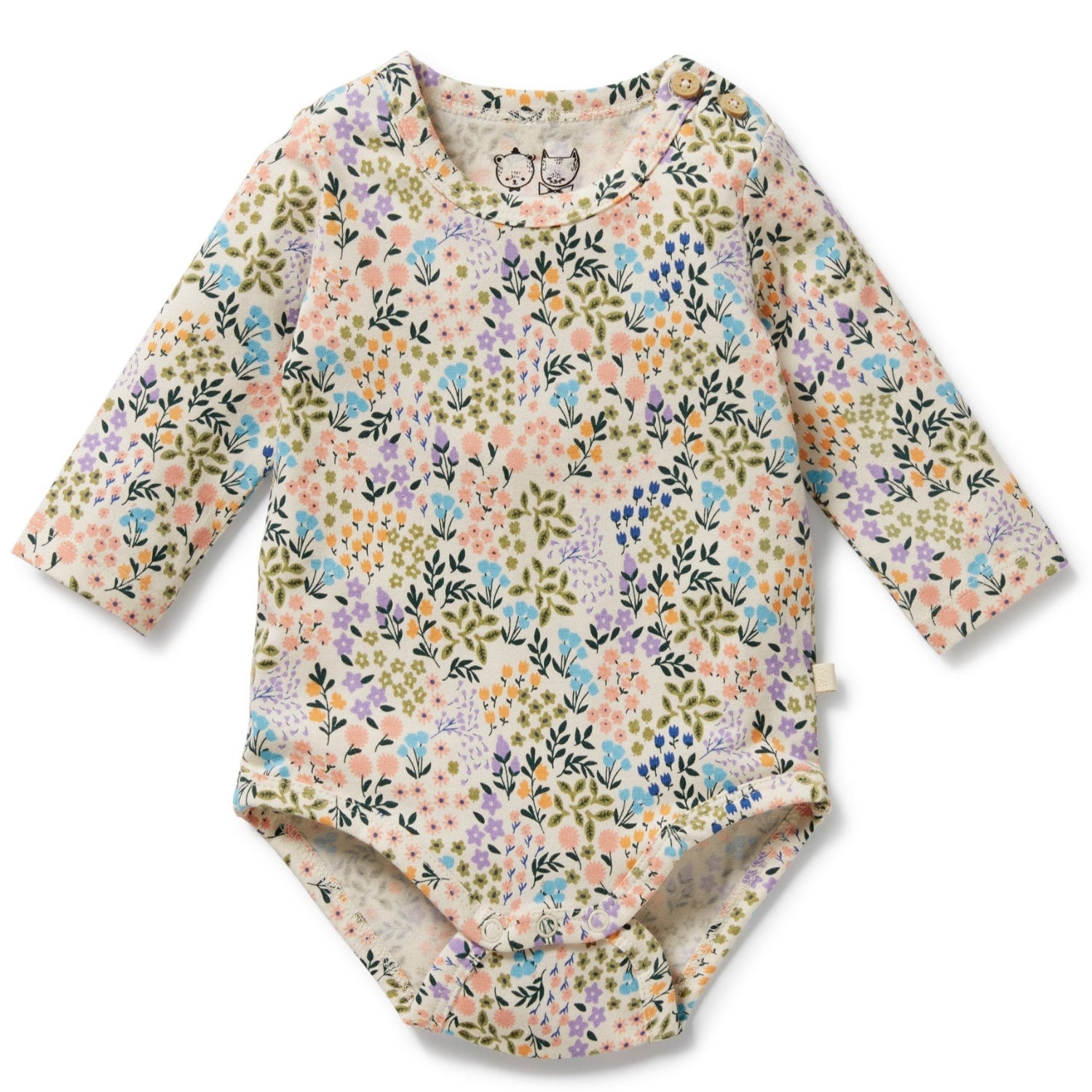 Skip to contentA charming blend of comfort and style in this adorable organic all-over floral print long sleeved bodysuit by Wilson and Frenchy. With a unique hand-illustrated flower print, this little piece is a must-have for your baby’s wardrobe. Easy snap leg opening offers hassle-free dressing and nappy changes, while the stretchy organic cotton guarantees unrivaled comfort.