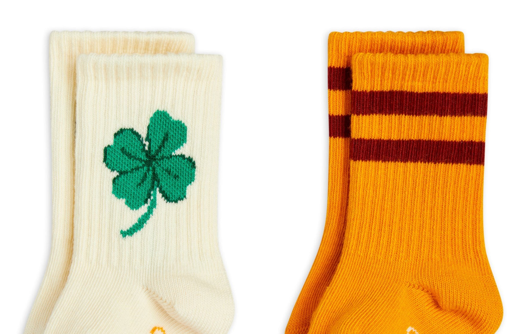 This adorable two-pack from Mini Rodini features one sock adorned with a cheerful green clover and another with fun stripes. Made from a cozy blend of GOTS certified organic cotton and polyamide, these socks are soft, stretchy, and built to last with reinforced toes and heels. Plus, Mini Rodini’s signature is playfully printed under each foot for a cute surprise!