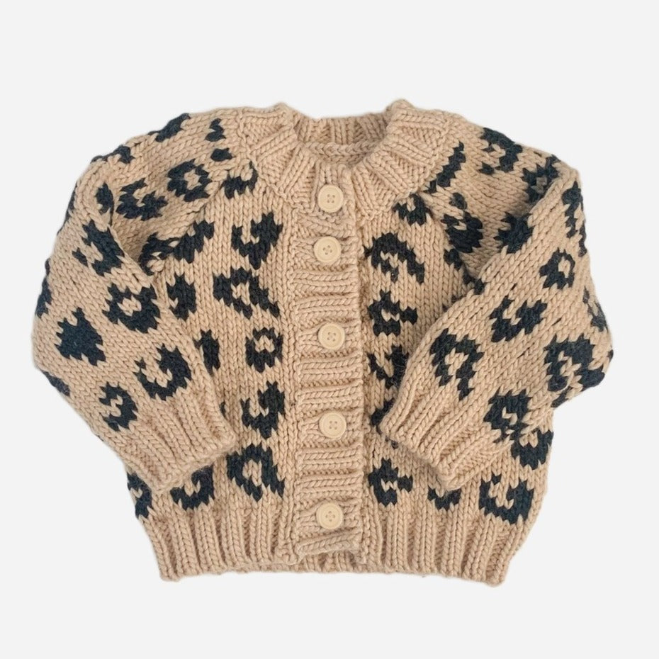 Skip to contentThis cheetah print sweater features wooden buttons cardigan style closure. Hand knit by loving hands. Cozy and ready for the cooler season.