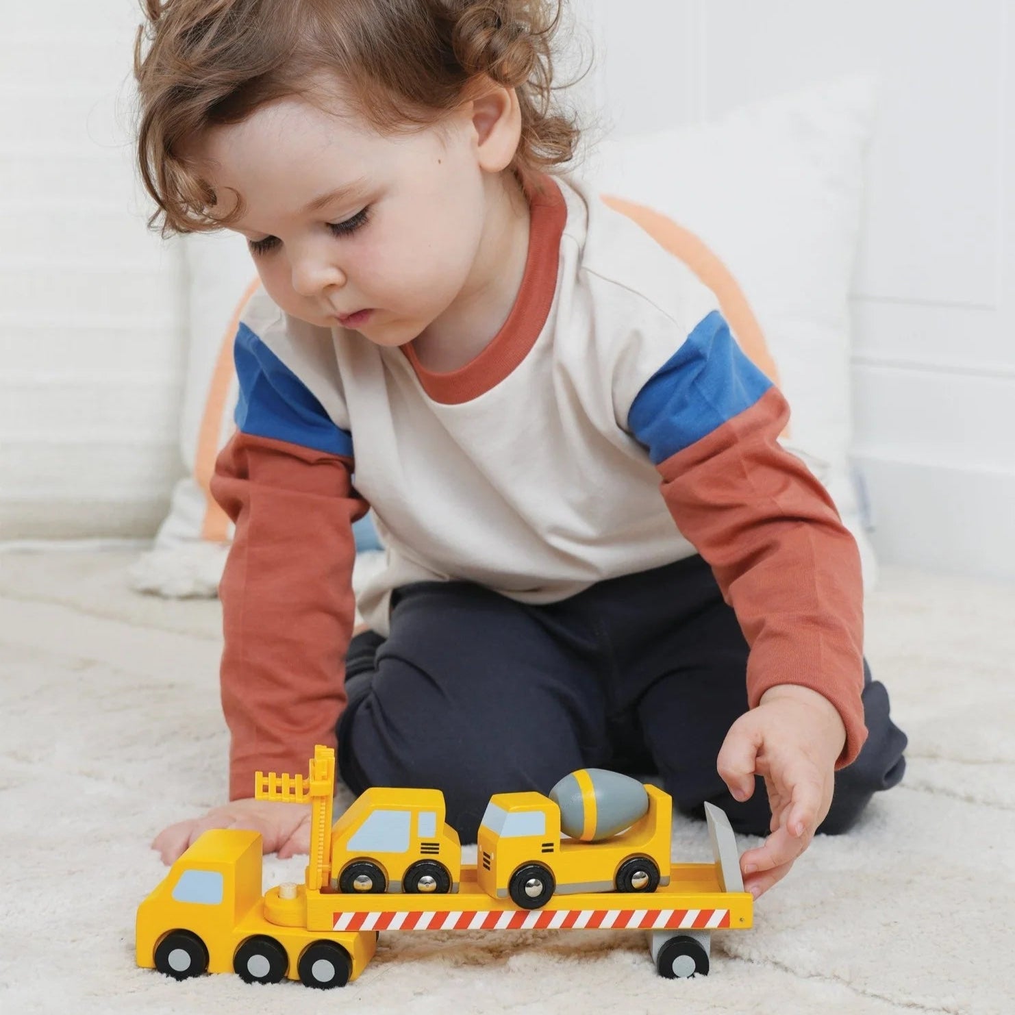 Skip to contentThis transporter is ready to haul construction vehicles to their next adventure! A cement mixer and heavy lifter are on their way to a fresh building site.