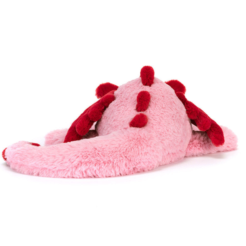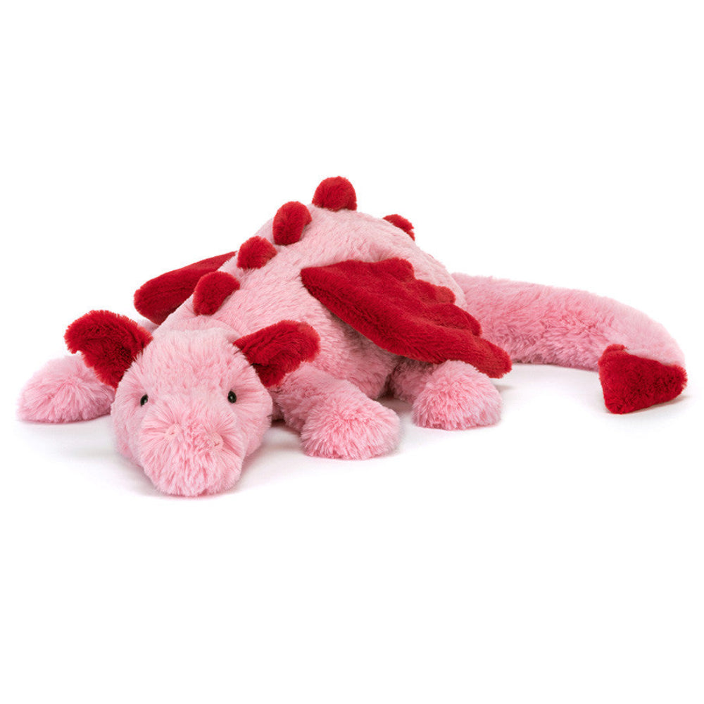 Skip to contentJellycat Heart Dragon is stretching out so we can admire that luscious pink fur and long cuddly body, carefully detailed with delicate stitching all over. With red wings, ears, spines and tail dart, flopsy paws and a long, weighted tail, Heart Dragon brightens up anyones valentine day!