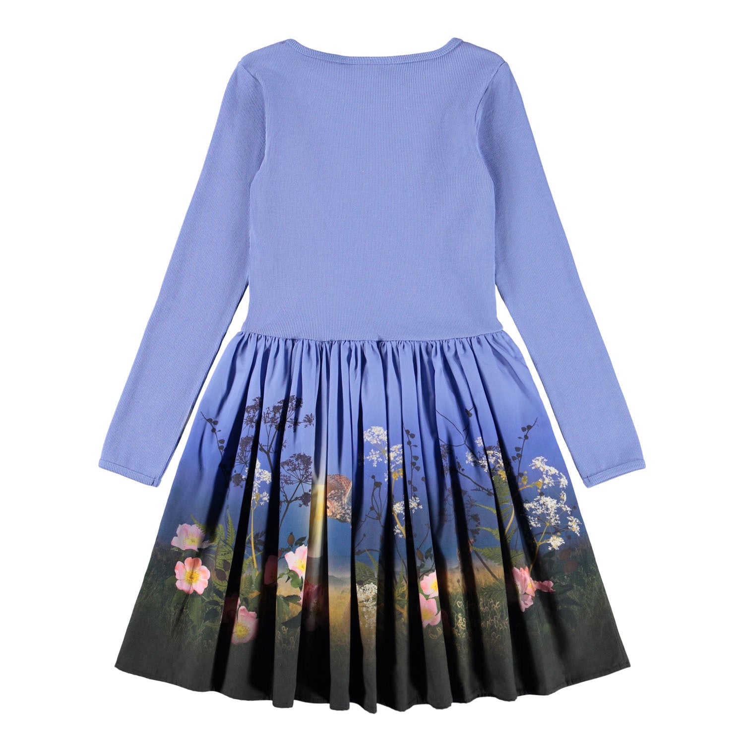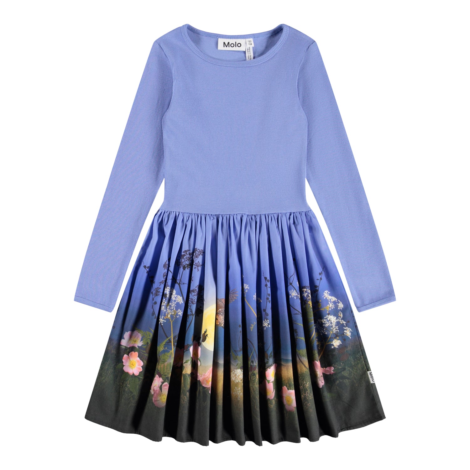 Skip to contentThis charming moonrise blue dress features long sleeves and is crafted from organic cotton. It combines a snug ribbed jersey bodice with a flowing poplin skirt, showcasing a delightful moon and nature print. Designed with a comfortable regular fit, it’s perfect for playful days and dreamy adventures.